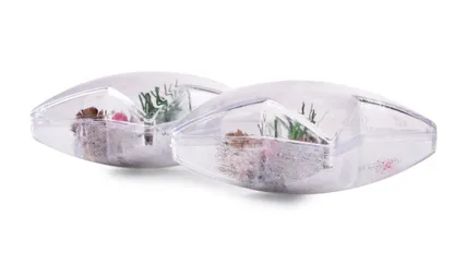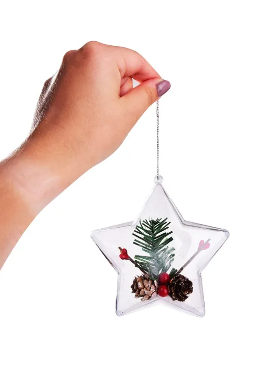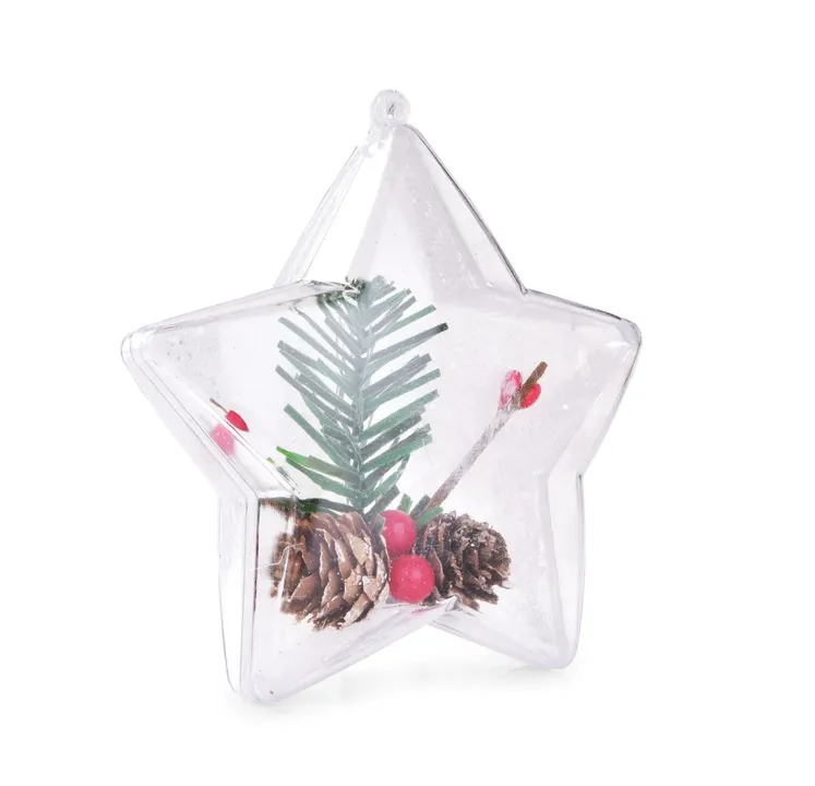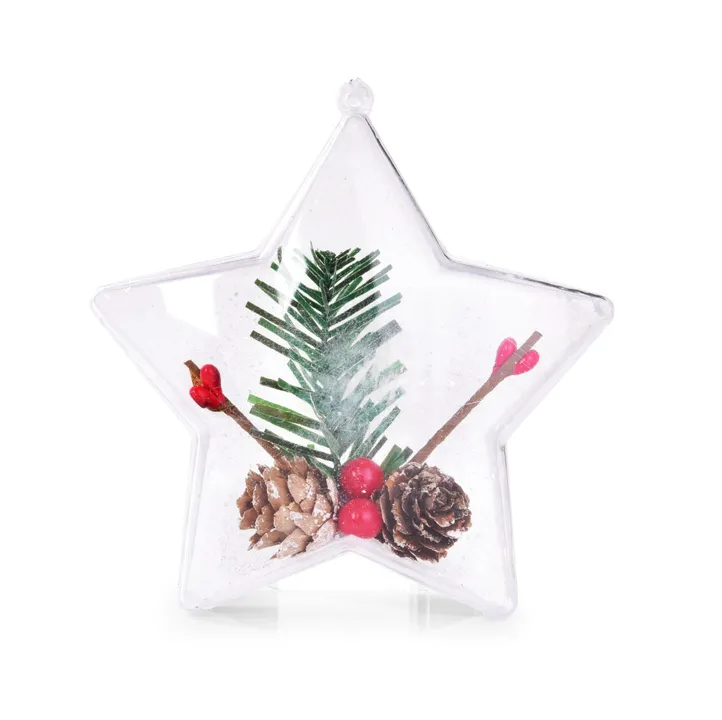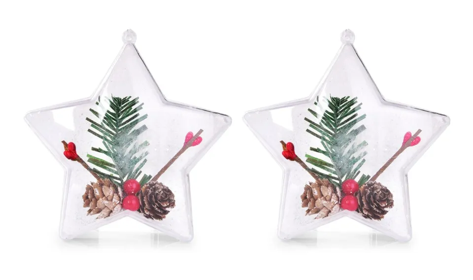 Átlátszó karácsonyi csillagok belső díszítéssel, ágvég, tobozok és bogyók, gyönyörű természetes díszek a fán és a téli kompozíciókban. Finom elegancia és részletek vonzzák a figyelmet a hagyományos és modern díszítésben. Készlet 2 db, 10 cm.