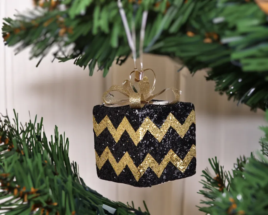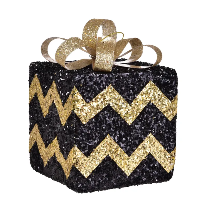 Függő dekoráció a fán. Elegáns díszdoboz fekete és arany kombinációban, feltűnő csillogó hatással és luxus masnival. Stílusos kiegészítő a belső tér ünnepi hangulatához. Magasság szalaggal: 11 cm.