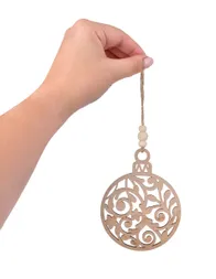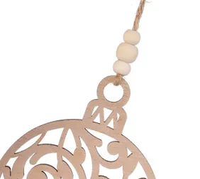 Függő fából készült dísz karácsonyi gömb formájában, finom csipke kivágással és természetes zsinórral gyöngyökkel. Behozza az otthonba a természet és a nyugalom érzetét. Átmérője kb. 11 cm.