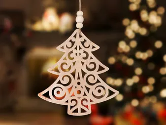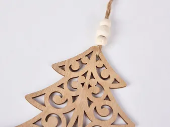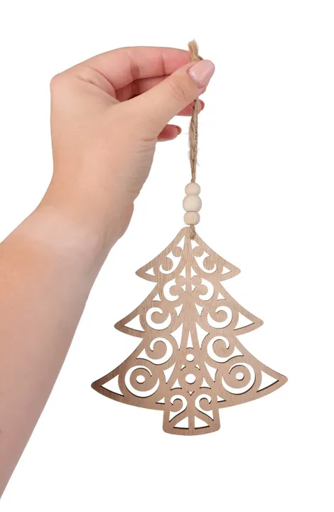 Függő fából készült fenyőfa finom csipkés kivágással és természetes zsinórral, gyöngyökkel. Teremts harmonikus és elegáns karácsonyi belső teret természetes árnyalatokban. A dekoráció magassága 11 cm.