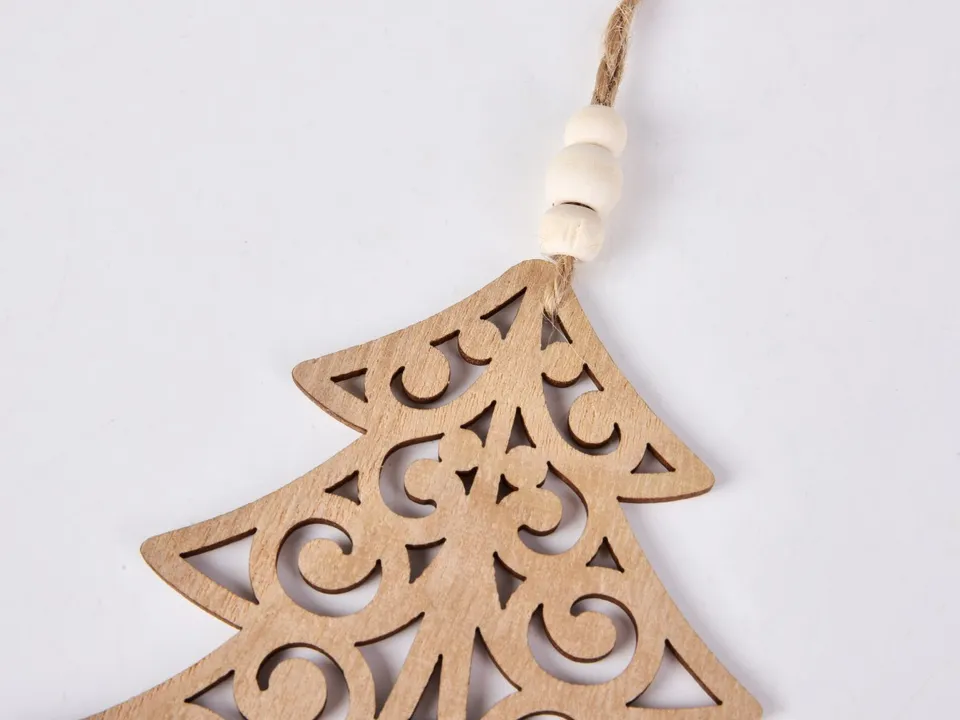 Függő fából készült karácsonyfa finom csipkés kivágással és természetes zsinórral gyöngyökkel. Hozz létre harmonikus és elegáns karácsonyi belső teret természetes színekben. A dekoráció magassága 11 cm.