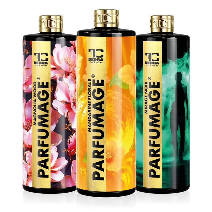 Családi csomag PARFUMAGE – mosási és takarítási parfümök MIRAGE NOIR, MANDARINE FLORALE és MAGNOLIA WOOD. Három népszerű illat a friss ruhákért és az otthonért. Praktikus választás a mindennapi mosáshoz és takarításhoz, hosszan tartó illatos hatással.