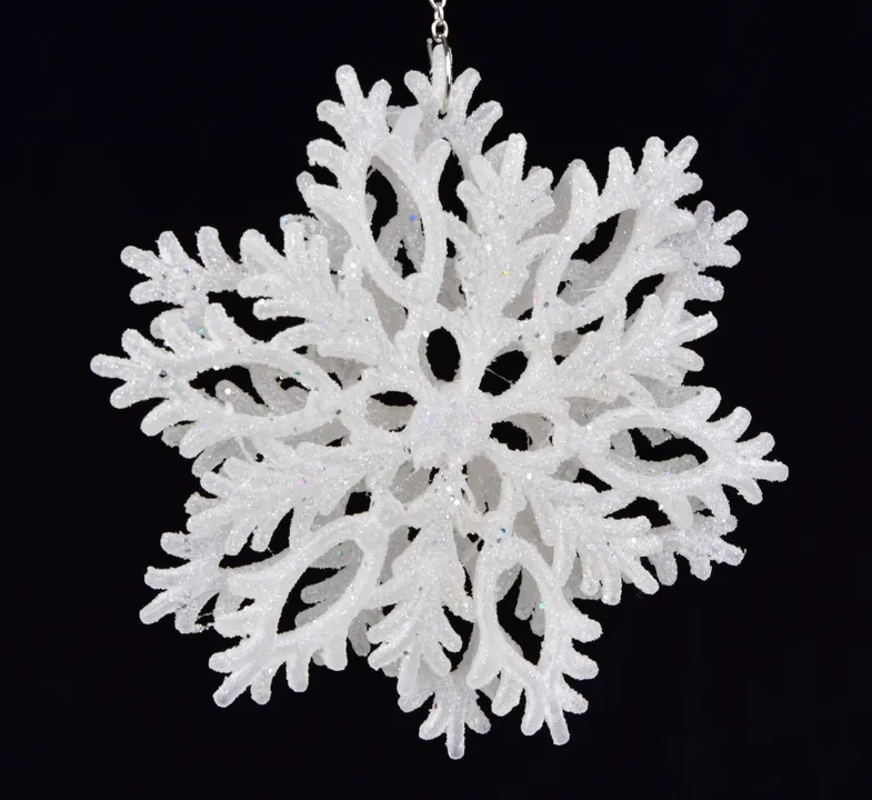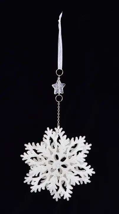 Csillogó dupla hópehely, 3D hatással, matt műanyagból, amely a zúzmarás jeget idézi. Elegáns karácsonyi dísz a fán az LEDES KIRÁLYSÁG kollekcióból. Átmérője 13 cm.