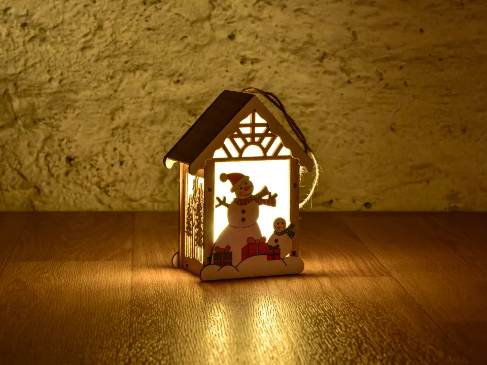 Fából készült házikó téli motívummal, két hóemberrel és LED világítással, amelya remegő láng hatását kelti. Méretek: 10 × 6 × 14 cm. Tápellátás: 3 × LR1130 (nem tartozék). ON/OFF gomb az alsó részén. Felszereléshez és állításhoz is alkalmas.
