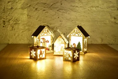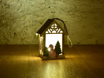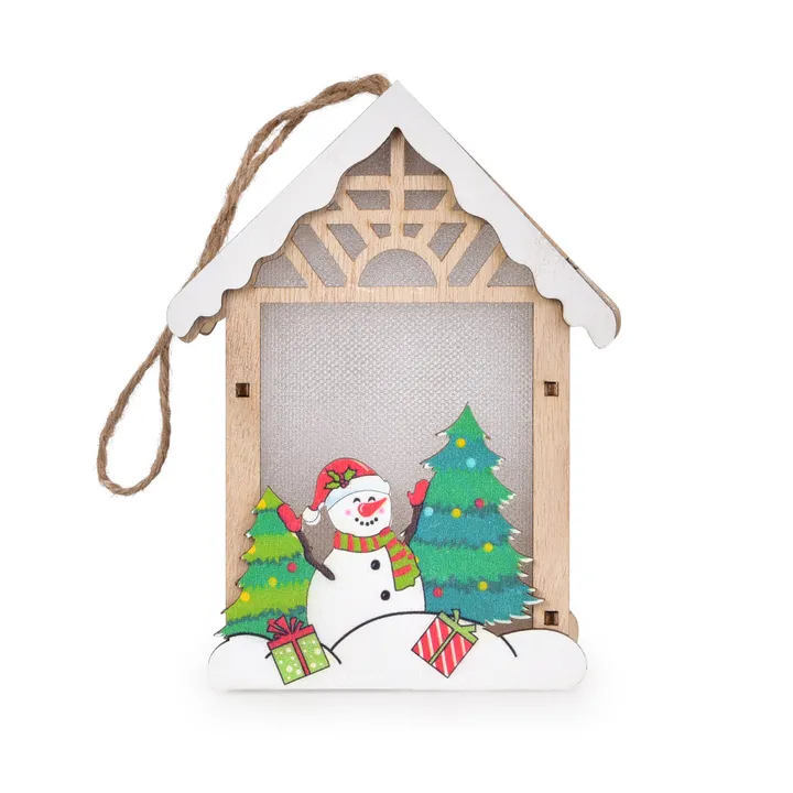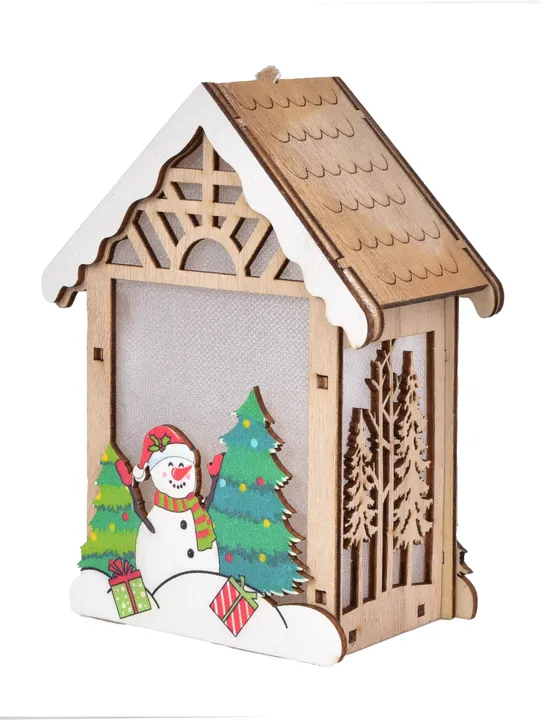 Fából készült házikó téli jelenettel és LED világítással. Hóember, fák és ajándékok motívuma. Fény, amely égő láng hatását kelti. Méretek: 10 × 6 × 14 cm. Táplálás 3× LR1130 (nem tartozék). ON/OFF gomb.