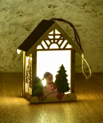 Fából készült házikó téli tájjal és LED világítással. A motívum hóember, fák és ajándékok. A fénypárás hatású, izzó lánggal. Méretek: 10 × 6 × 14 cm. 3× LR1130 elemmel működik (nem tartozék). ON/OFF gomb.