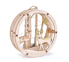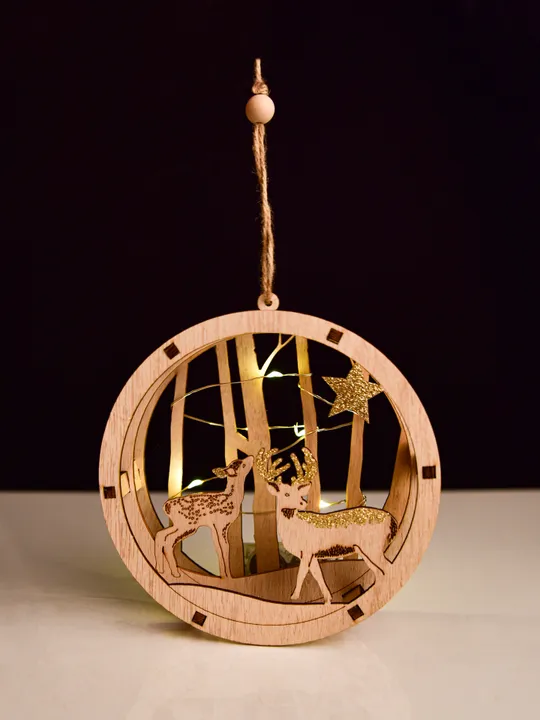 Fából készült függő LED kompozíció erdő és szarvasok motívumával. Átmérő 15 cm, elemmel működik. Csodálatos karácsonyi dekoráció ablakba vagy fülkébe.