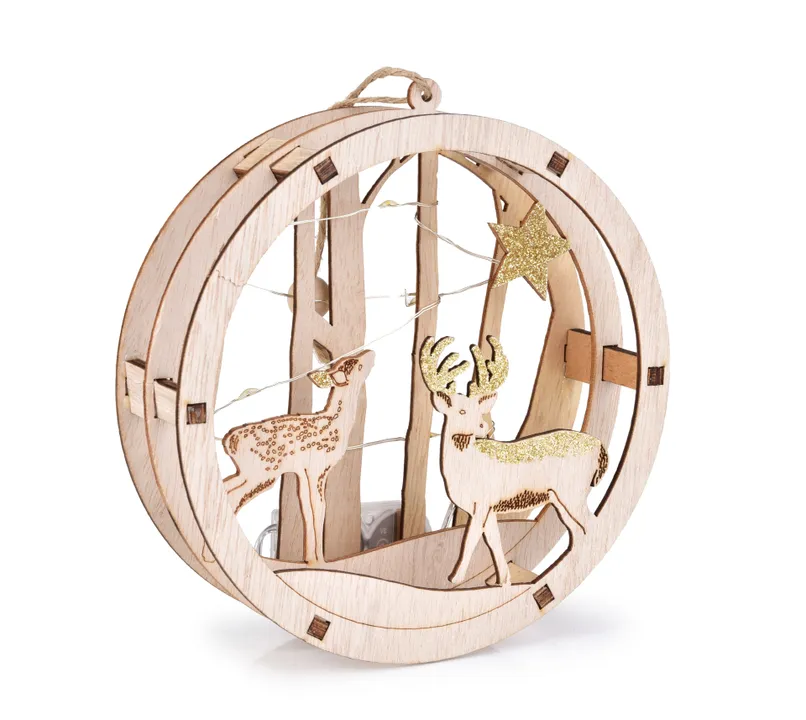 Fából készült LED dekoráció erdei és szarvasmotívummal. Átmérő 15 cm, elemmel működik. Gyönyörű karácsonyi dekoráció ablakba vagy niche-be.