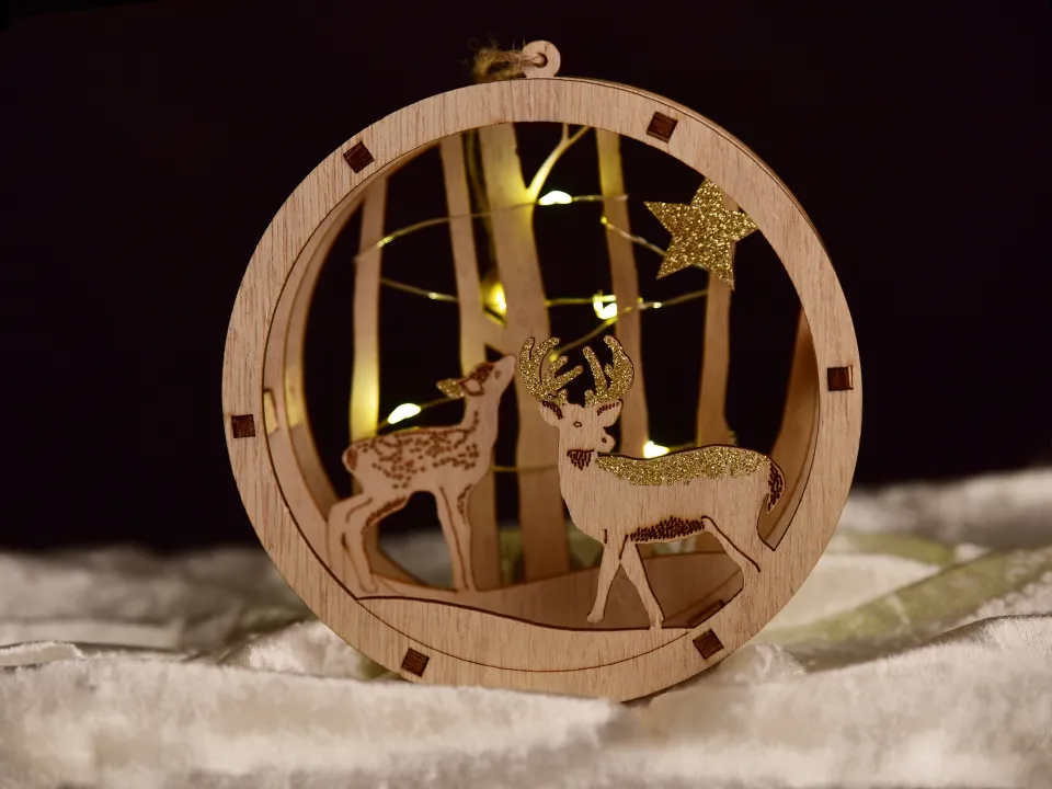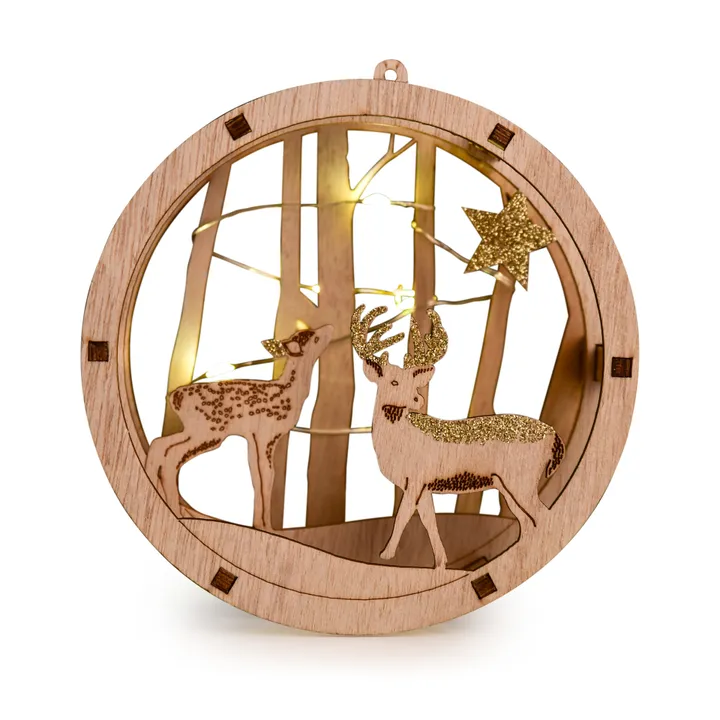Finom fény, amely átszűrődik az erdő fáin, ahol találkozik két szarvas… A WOODEN FOREST GLOW egy darab varázslatos téli erdőt hoz közvetlenül a te otthonodba. A kézzel készült fa dekoráció arany csillagokkal és lágy LED világítással minden sarkot beragyog – akár az ablakban, niche-ben, vagy az ünnepi asztal felett függesztve. A romantikus látvány a szívekhez közel hozza a karácsonyi pillanatok nyugalmát és meghittségét.