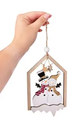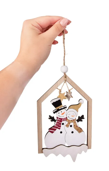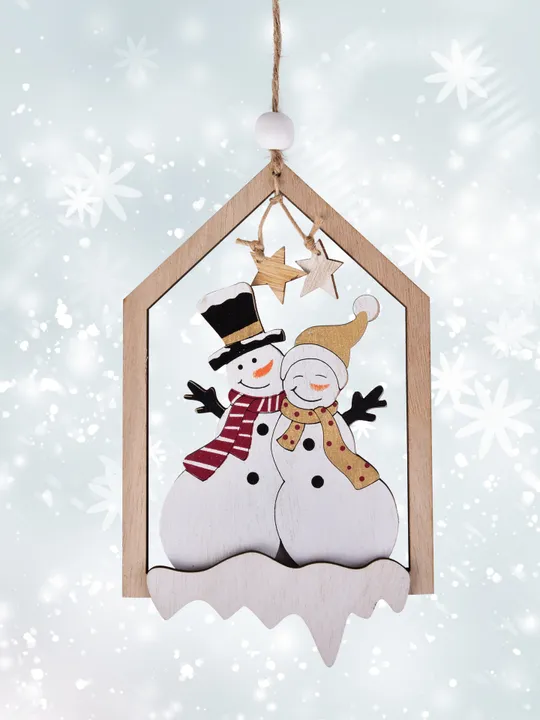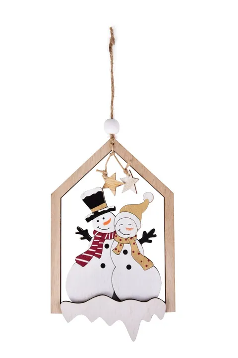 Fából készült függő dekoráció házikó formában aranyos hóemberekkel, csillagokkal és természetes zsinórral. Ideális karácsonyi díszítéshez fákra, ajtókra vagy ablakokra. Magasság 16 cm.