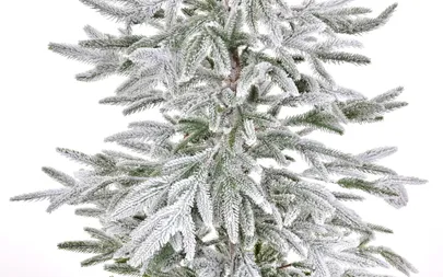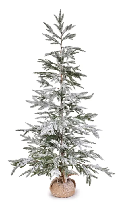 Magas, 160 cm-es, realisztikus tűlevelű, hóval borított karácsonyfa. Stabil, juta anyaggal bevont talppal. Ideális önálló dekorációként a belső térbe, a recepción vagy a ünnepi előtérbe.