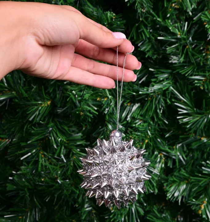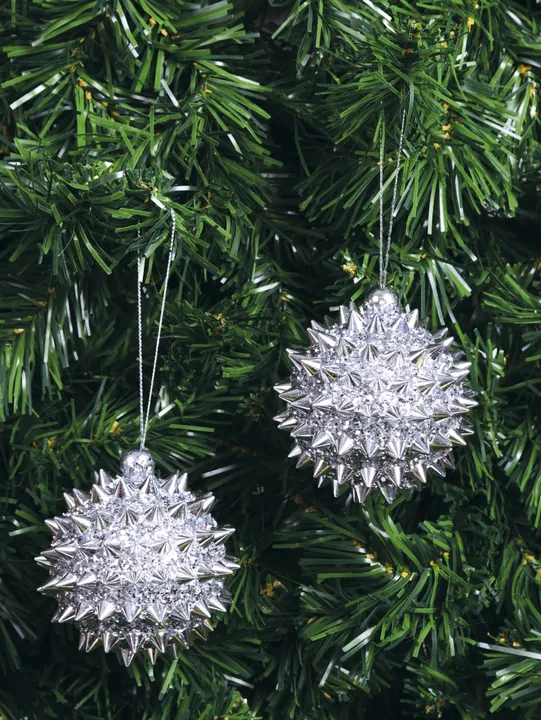 2 darab ezüst dísz szett, plasztikus hegyes felülettel és magas fényességgel. Elegáns és extravagáns egyszerre, tökéletesen kiemelkedik a zöld karácsonyfán. Minden gömb átmérője 7 cm.