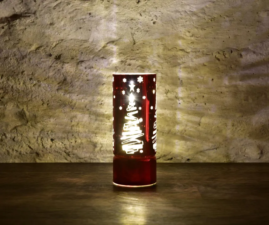 TÉLI FA FÉNYEK – elegáns LED gyertyatartó fényes vörös üvegből, hóval borított fát ábrázoló mintával, mely meleg fénnyel világítja meg otthonát. Belsejében tükörfelület rejtőzik, amely a fényeket csillogó csillagokká tükrözi a téli égbolton.