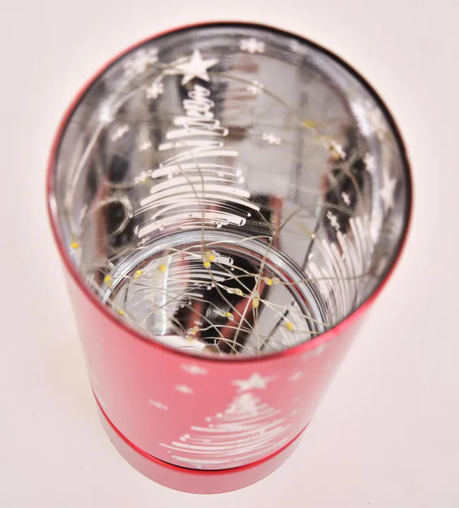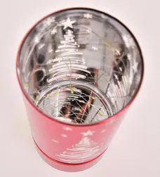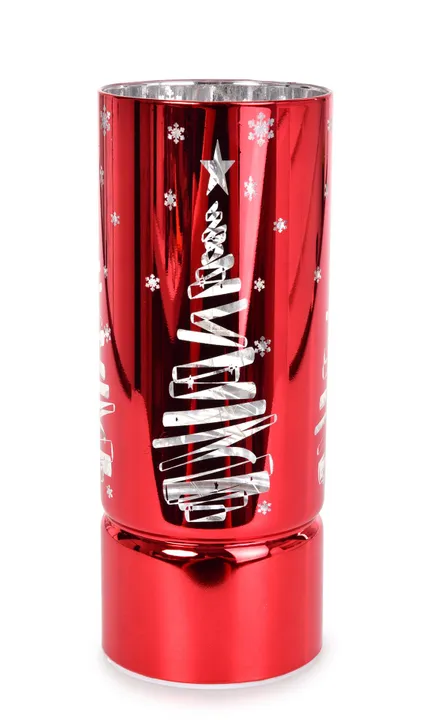 A vörös üveggyertyatartó karácsonyfás és finom hópihés mintájával meleg fénnyel világítja meg az enteriőrt. Belsejében tükörhatás, LED világítás elemmel, magassága 20 cm. Ideális az ünnepi hangulathoz.