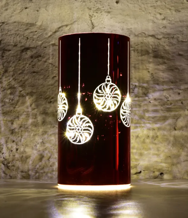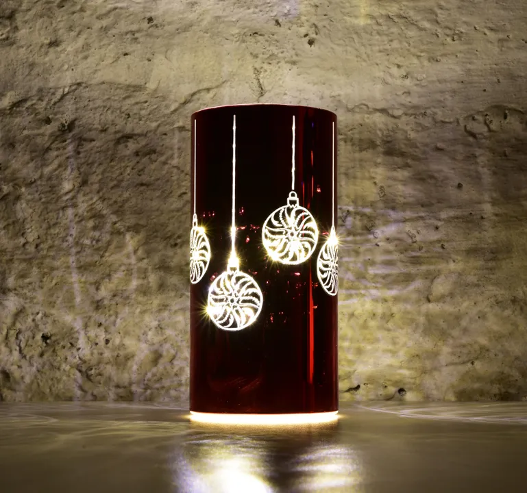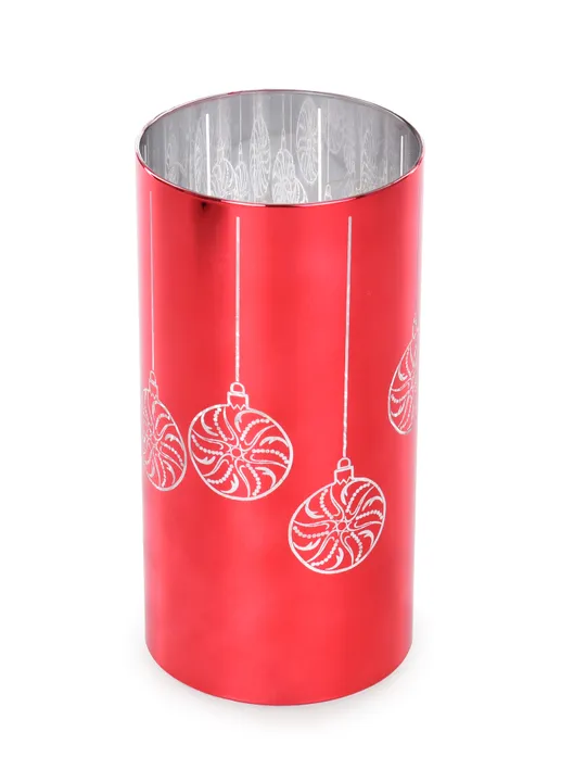 A karácsonyi üvegtartó LED világítással és tükörhatással minden belső teret ragyogóvá tesz. A piros motívum karácsonyi díszekkel meleg és otthonos fényt teremt. Magasság 20,5 cm, átmérő 10 cm, tápellátás 3× AAA elem.