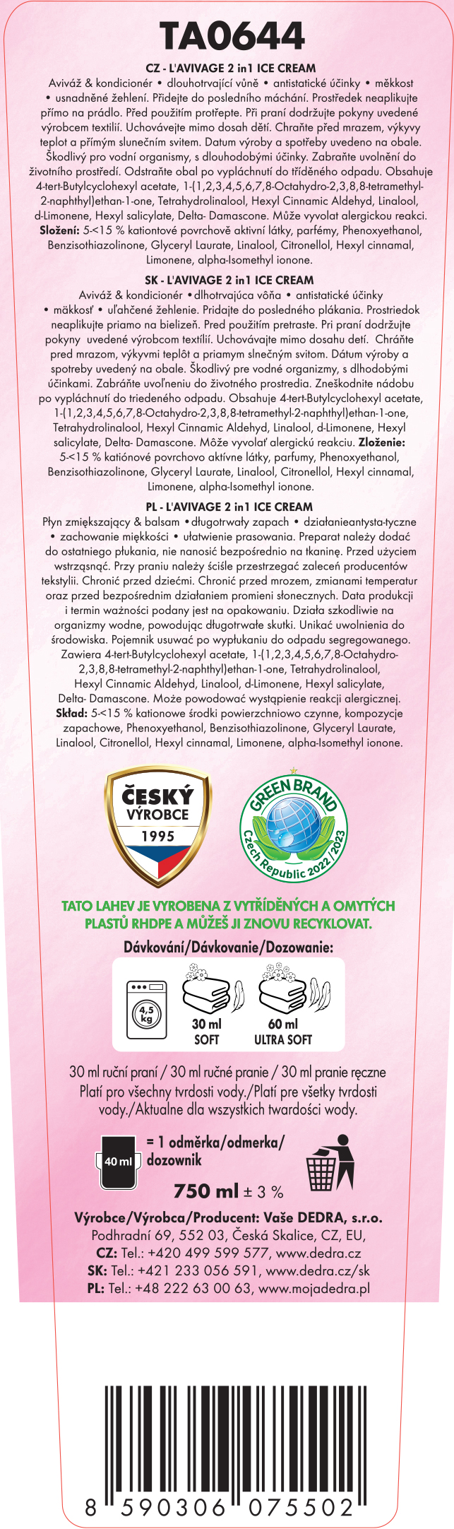 A SZETT a következőket tartalmazza: 1 x L'AVIVAGE 2in1 kondicionáló 750 ml, 1 x ECO Parfüm Super Concentrate PARFUMAGE® 750 ml, 1 x ECOultra AQUATIX® mosogatószer koncentrátum 500 ml.