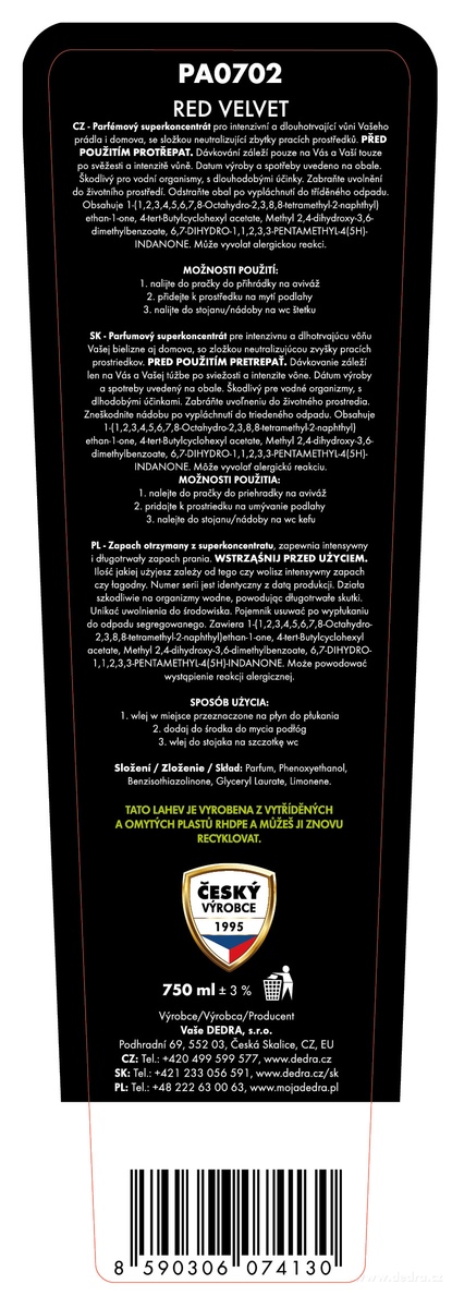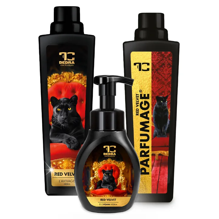 A RED VELVET szett tartalmaz: öblítő kondicionáló 750 ml, mosási és takarítási parfüm PARFUMAGE® RED VELVET, 750 ml, habzó szappan kézre és testre 300 ml