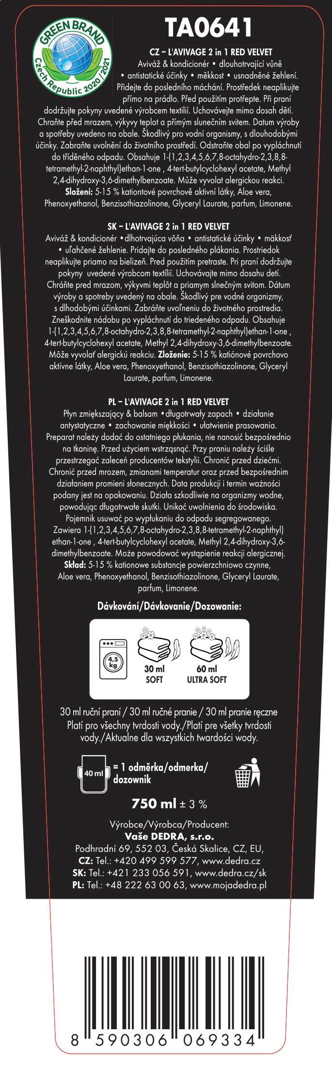 1x Öblítő kondicionáló, RED VELVET, L'AVIVAGE® 2in1, 750 ml