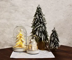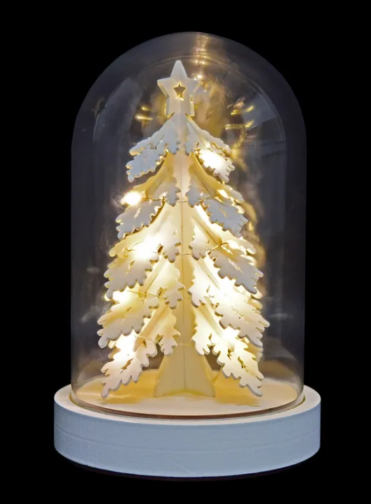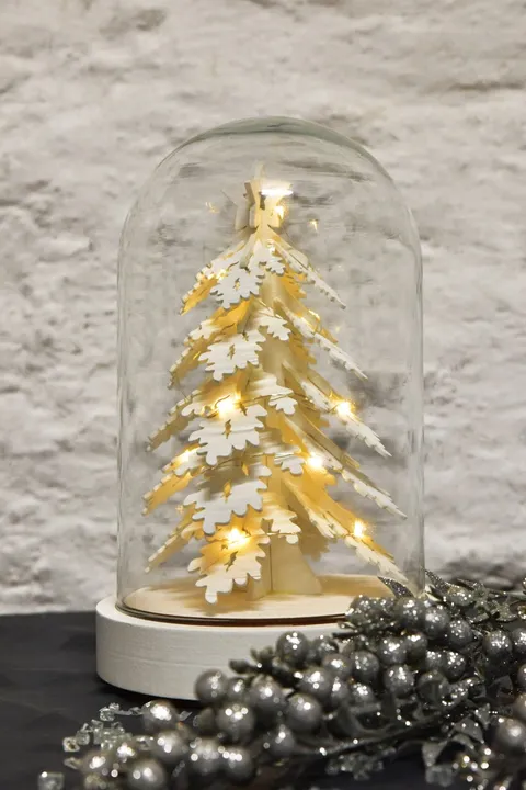 Elegáns LED dekoráció fából készült fának üvegbúrában. Magassága 27 cm, átmérője 17 cm. Meleg fehér fényt áraszt, 2× AA elemmel működik. Stílusos kiegészítő modern és klasszikus belső térhez egyaránt.