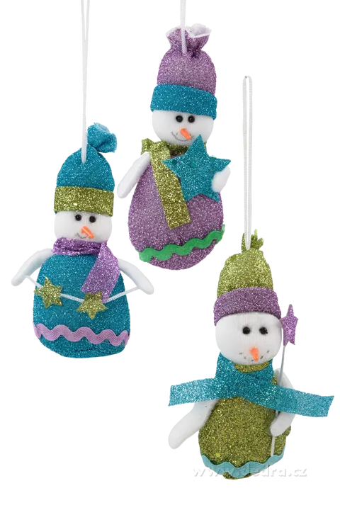 A három aranyos hóember formájú felfüggesztett dísz minden mese-karácsony kedvelőt elragad. A kézzel varrott és aprólékosan díszített hóemberek csillogó csillagokkal, sapkákkal és sálakkal egyszerűen felakaszthatók a fára, egy ágra vagy a gyerekszobába. Tökéletes kis karácsonyi ajándékként vagy ünnepi asztali díszként is.