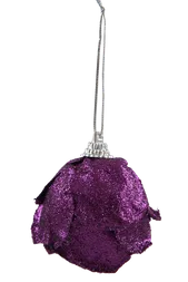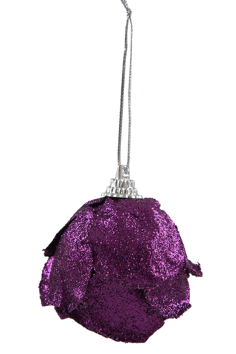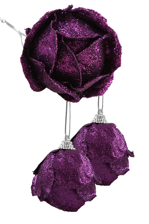 3 lila karácsonyi dísz készlet rózsa bimbók formájában, kifejező csillogó felülettel. Elegáns és szokatlan dekoráció a karácsonyfára vagy ünnepi dekorációhoz. Minden bimbó magassága: 5,5 cm.