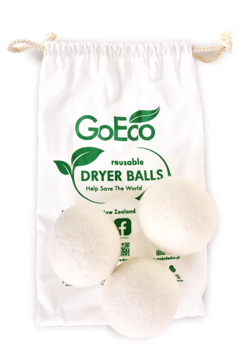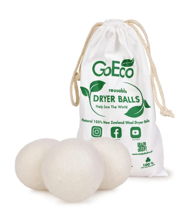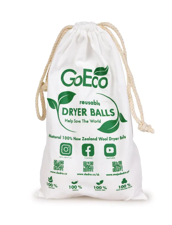 GoEco® SZÁRÍTÓGOLYÓK - 3 db valódi juhgyapjúból készült szárítógplyó készlet időt és energiát takarít meg a ruhák szárításakor (akár 20%-kal lerövidíti a folyamatot). Eldobható kendők helyett újrafelhasználható, nem hagynak szöszt, és mosószerparfümmel illatosíthatóak. Praktikus pamutzacskóban.