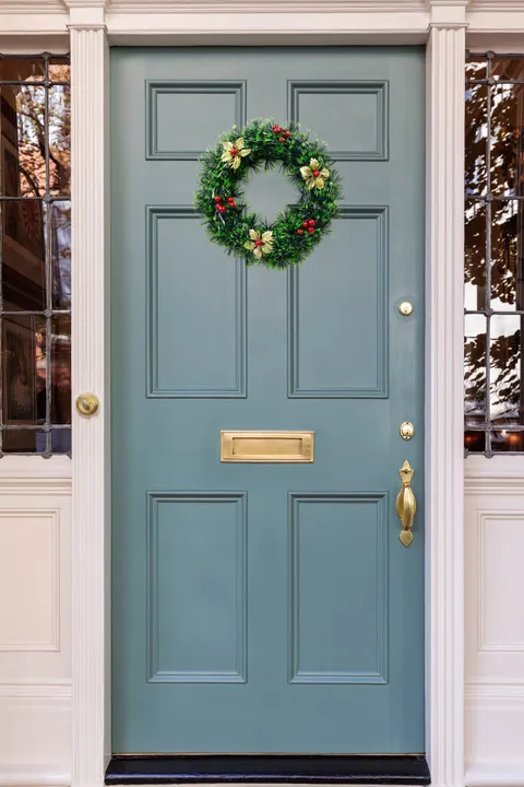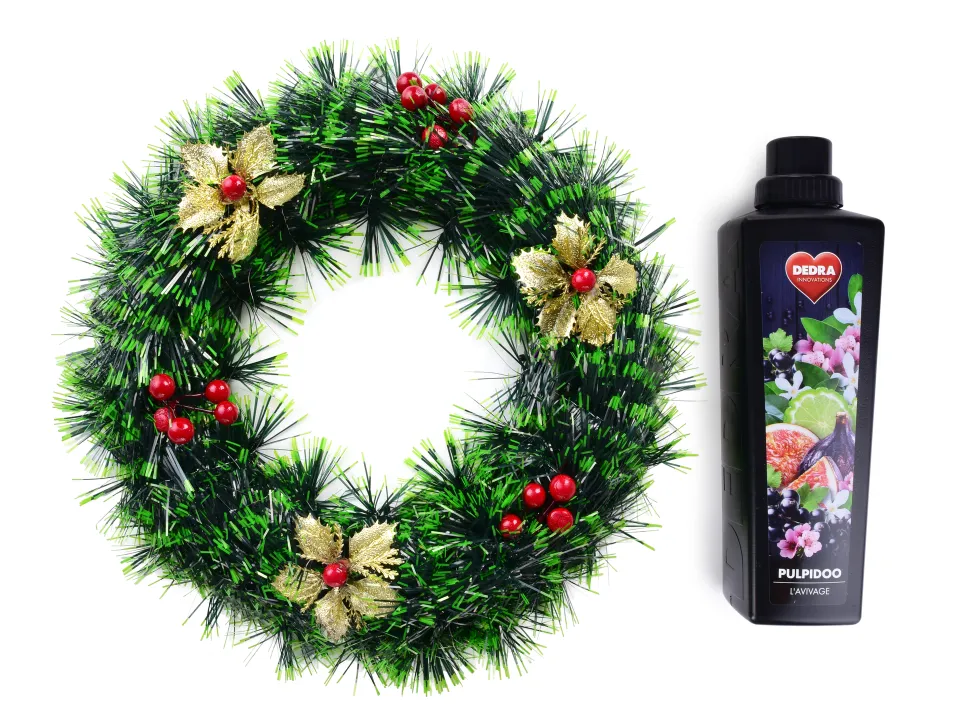 30 cm átmérőjű karácsonyi dekoratív koszorú klasszikus zöld alapra, arany virágokkal és piros bogyókkal. Romantikus dísz az asztalra és az ajtóra. Meleg ünnepi hangulatot hoz a belső térbe, tele hagyománnyal.