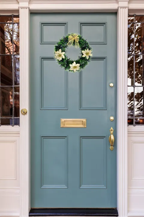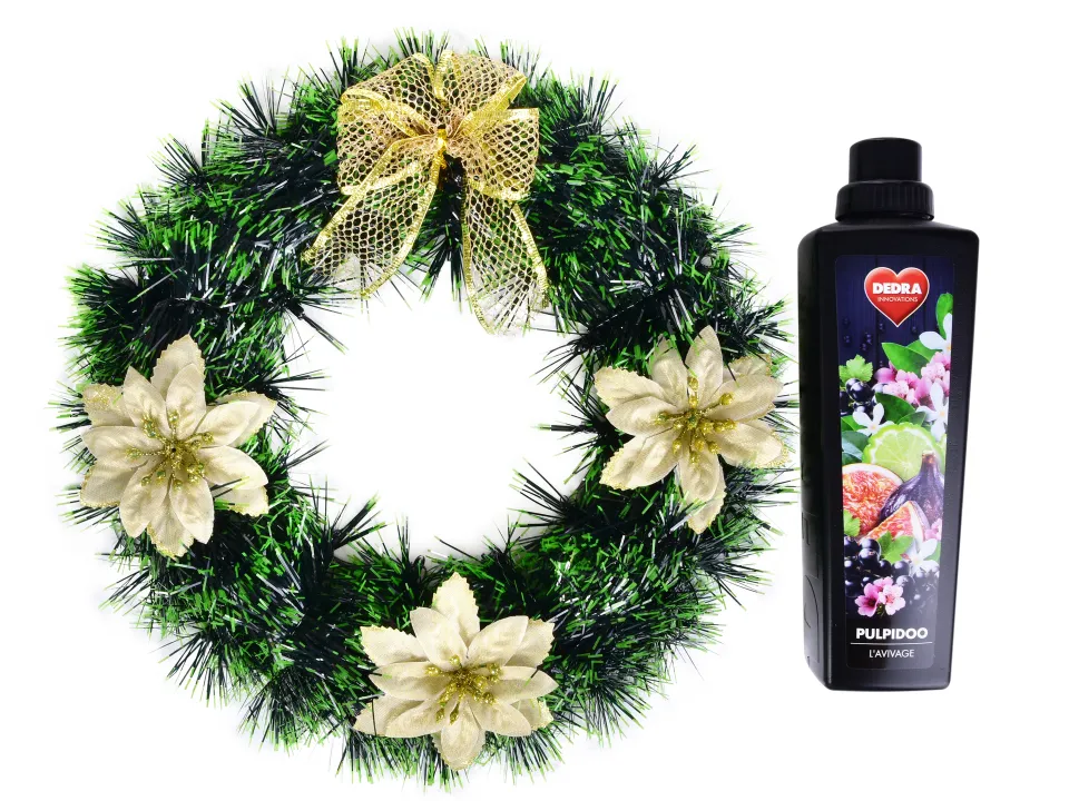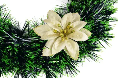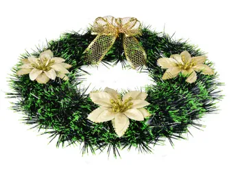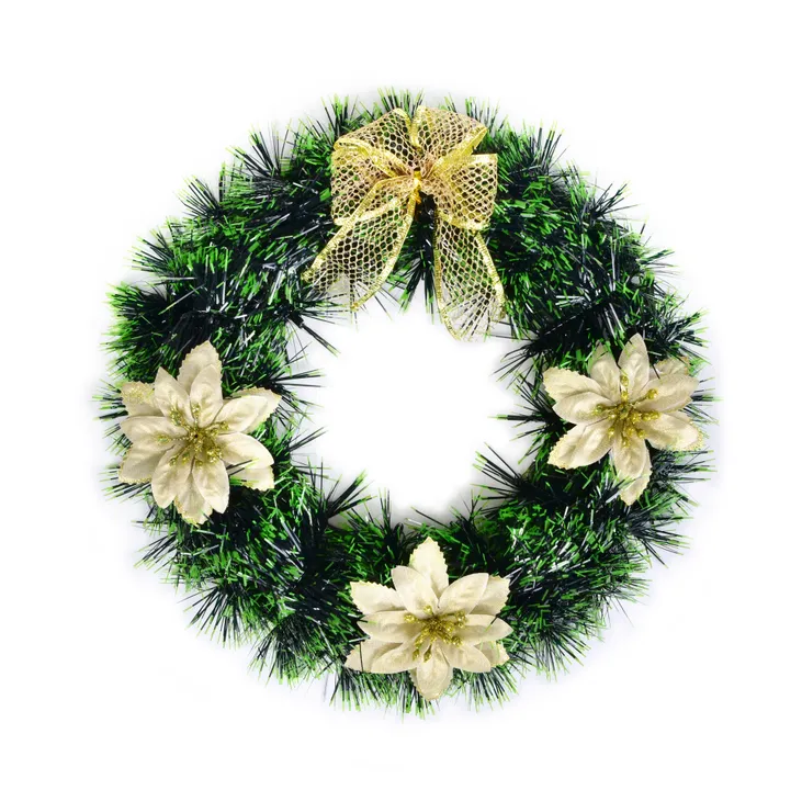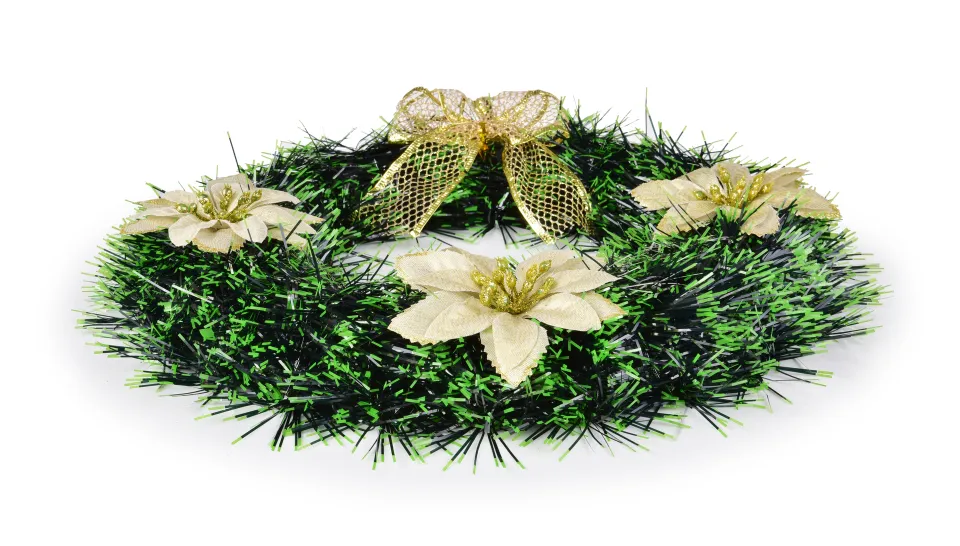 Elegáns karácsonyi koszorú, 30 cm átmérőjű, természetes zöld alapú, arany virág dekorációval. Kiváló középpontként az asztalon, valamint függő dekorációként a bejárati ajtón. Hagyományos karácsonyi hangulat bájjal.