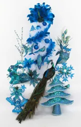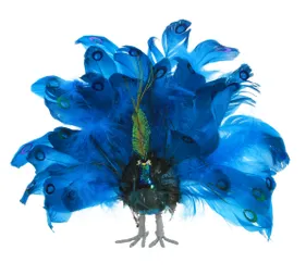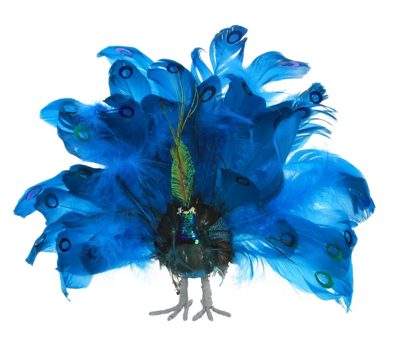 Luxusos kék páva igazi tollakkal, flitteres csillogással és finom tollakkal, mint a tél lehelete. Figyelemfelkeltő, álló dekoráció, amely fényt hoz a belső térbe, és nemes téli varázst csempész bele.