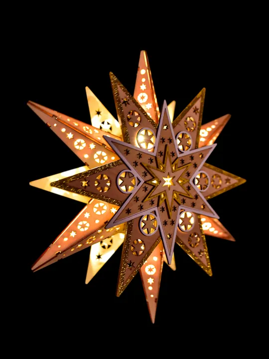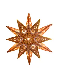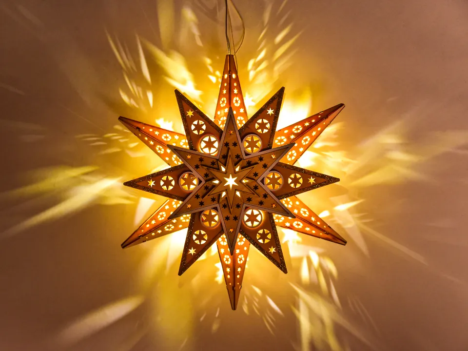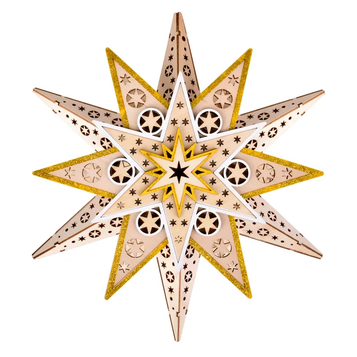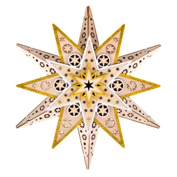 Függesztett fából készült csillag LED világítással ragyog minden irányból, és csodálatos fényvisszaverődéseket varázsol. Átmérője 30 cm. A kétoldalas kialakítás lehetővé teszi, hogy a csillag csendes ragyogással és belső nyugalommal töltse meg a teret.