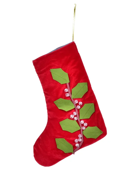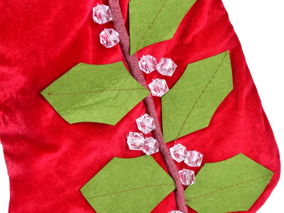Hagyományos mikulás zokni piros színben, magyalkorom mintával. Magassága 35 cm. A gyerekek felakaszthatják az ablakra, és Mikulás december 6-án megtölti édességekkel. Gyönyörű és puha dekoráció Szent Miklósra.
