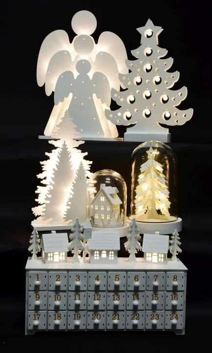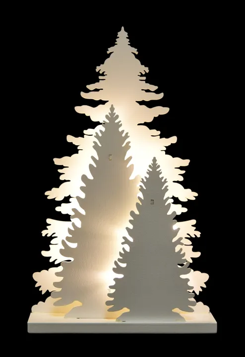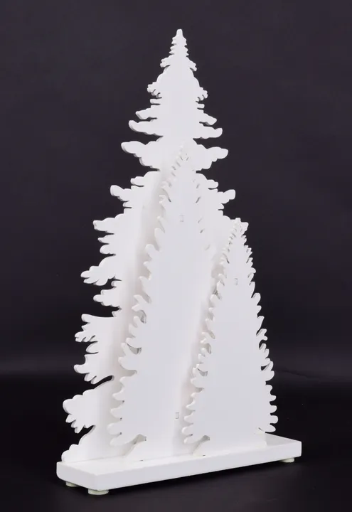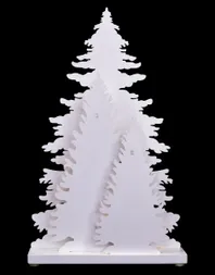 Három fehér fából készült fácska ragyogó LED fényekkel a hajnali fényben ázott csendes téli erdőt idézi. Magassága 35 cm, elegáns dekoráció asztalra vagy ablakra. Békét, harmóniát és az ünnepi várakozás varázsát hozza a belső térbe.