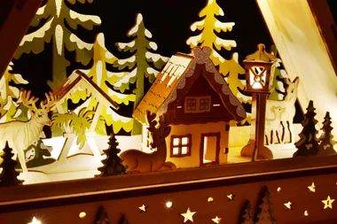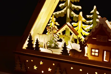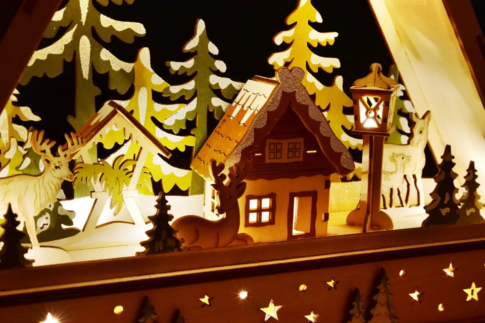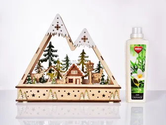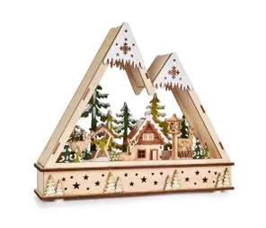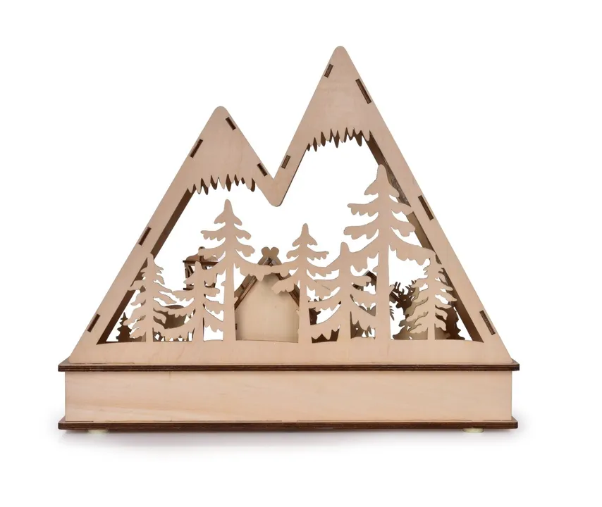 A havas hegyi táj, egy kis házzal és erdei állatokkal, finom LED fényekkel megvilágítva, csendes téli éjszaka érzetét kelti. A 35 cm széles, részletesen kidolgozott fa dísz nyugalmat, harmóniát és a természet érintését hozza otthonába.