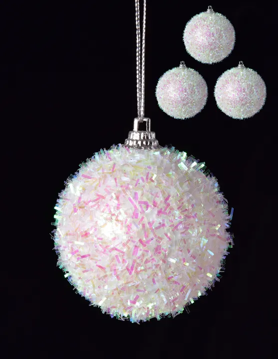 4 db luxusos golyó fehér színben, finom gyöngyházlamelákkal és csillámokkal. A ragyogó gyöngyház effektus varázslatos fényjátékot teremt, amely felragyogtat minden karácsonyfát vagy téli dekorációt. Átmérője 9 cm.
