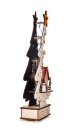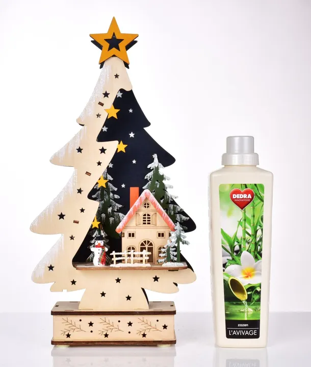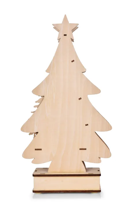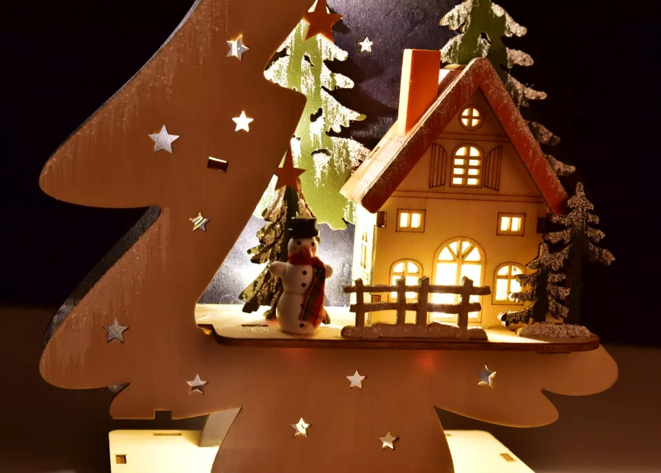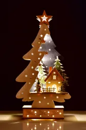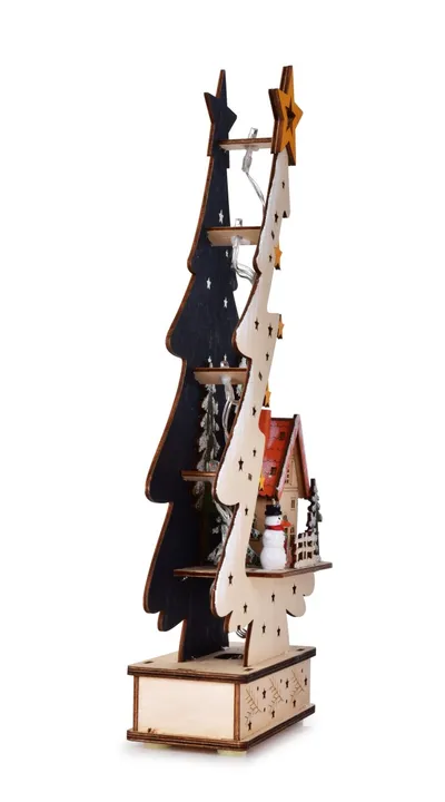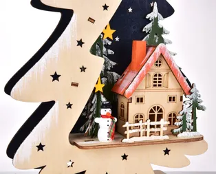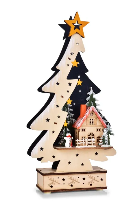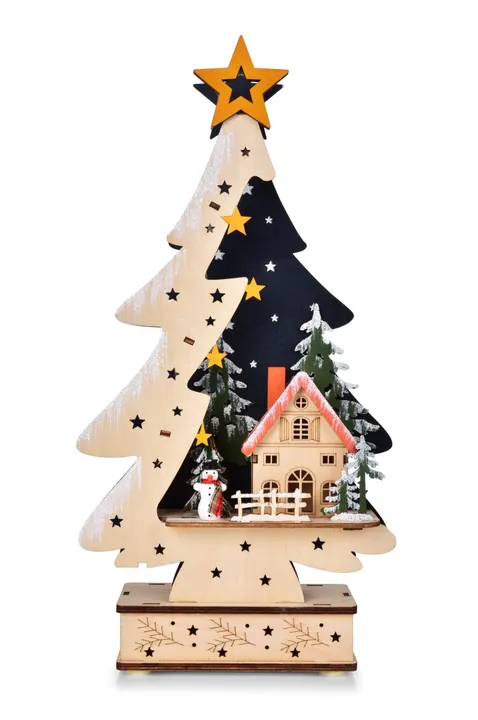 A karácsonyfa formájú dísz egy varázslatos téli csendéletet rejt magában, amelyben viszontláthatjuk a kis házikót, a hóembert és a világító LED világítást. Magassága 40 cm. A fából készült kivitelezés a nyugalom, a gyermekkor és a havas estével teli kellemes atmoszférát idéz meg.