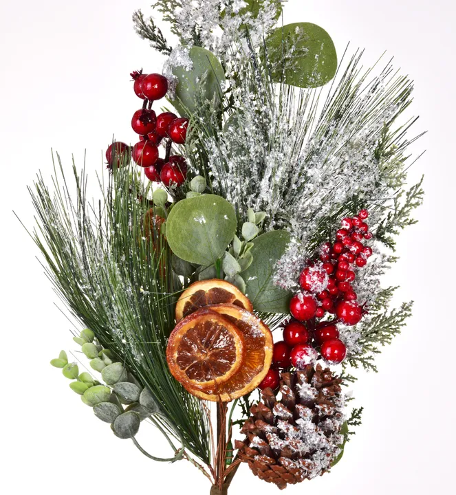 Függő karácsonyi ágcsokor, amely akasztólyukának köszönhetően könnyen lógatható falra, ajtóra vagy ablakra. Tűlevelek, bogyók, fenyőtoboz és szárított narancs lágy csillogással varázsolják elő a bűvös téli légkört. Magassága 50 cm.