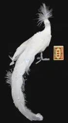A finom gyöngyökkel, puha tollakkal és flitterekkel díszített fehér páva hosszú farka 50 cm (!!!), szélessége 6 cm x magassága 13 cm.