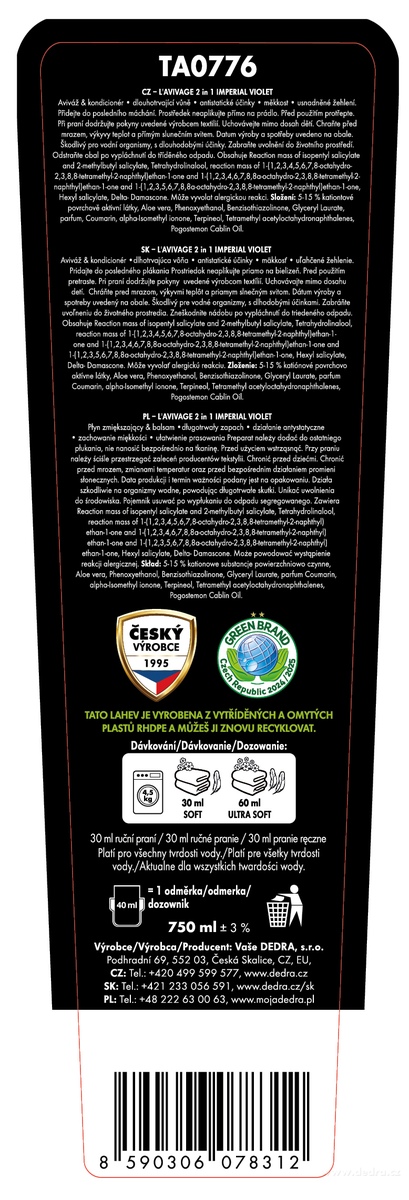 Az öblítő kondicionáló L’AVIVAGE 2in1 egy KÉT KOMPNENSBŐL ÁLLÓ antistatikus, puhító és illatosított termék, amelyet a mosás utolsó öblítéséhez adunk hozzá, vagy kézi mosás során használunk. 750 ml egyenértékű 4,5 l szokásos öblítővel.