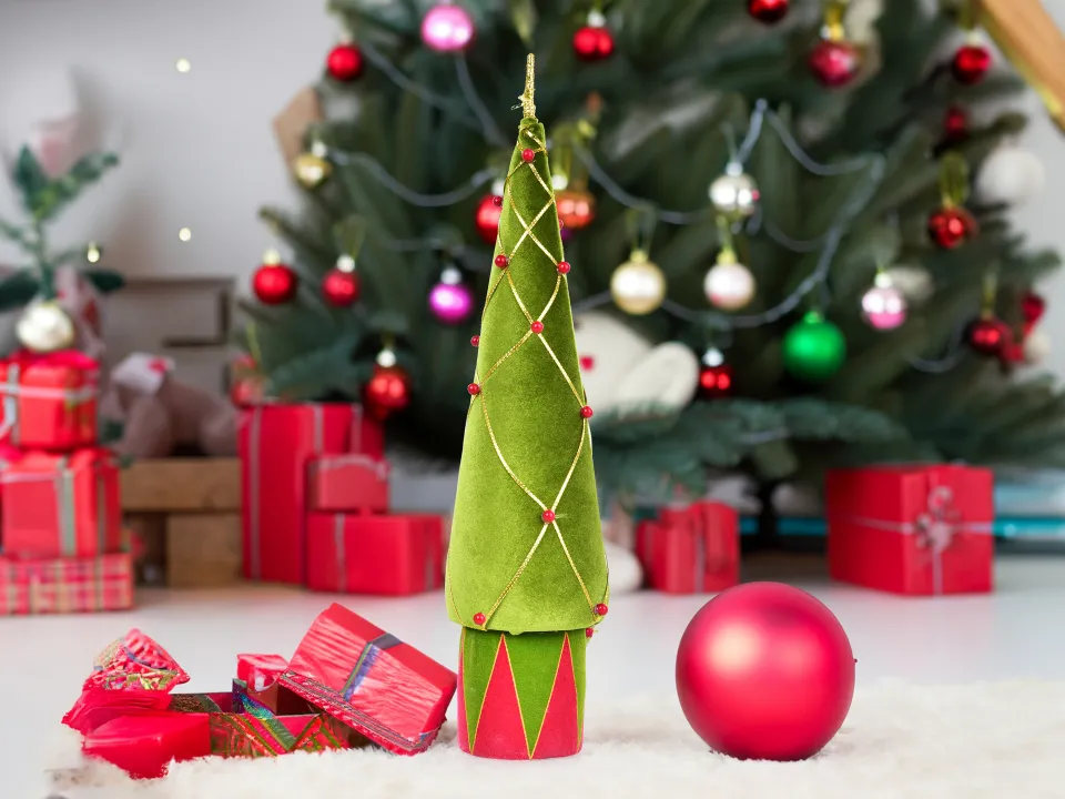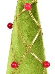 Stílusos karácsonyi fenyőfa puha velúrból, piros gömbökkel és arany varrással. Magasság 55 cm, alapátmérő 9,5 cm. Kiemelkedő ünnepi dekoráció merész színekben, ideális asztalra, polcra vagy kirakatba.