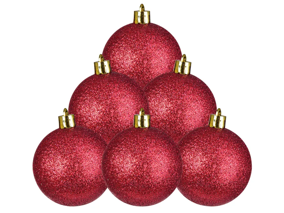6 db piros karácsonyi gömb készlet intenzív csillogással, amely minden karácsonyfát ünnepélyes eleganciával és klasszikus karácsonyi varázzsal ragyogtat el.