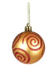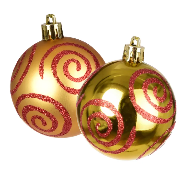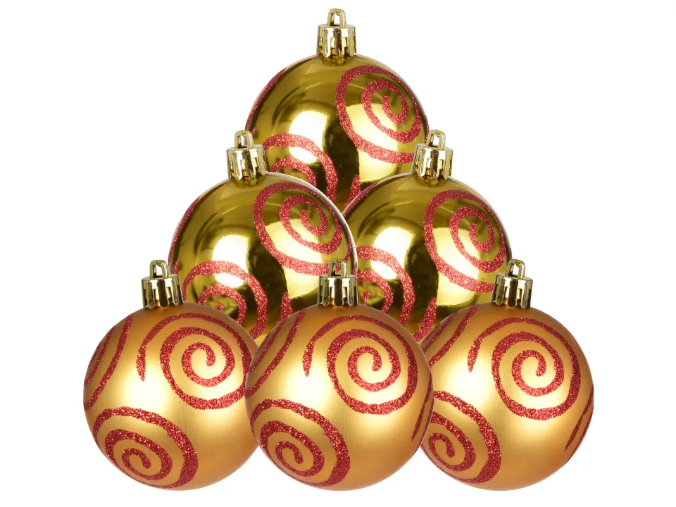 6 db arany karácsonyi gömb, piros spirálokkal játszó és elegáns díszítést hoz létre, amely csillogó ünnepi hangulatot varázsol fádra.