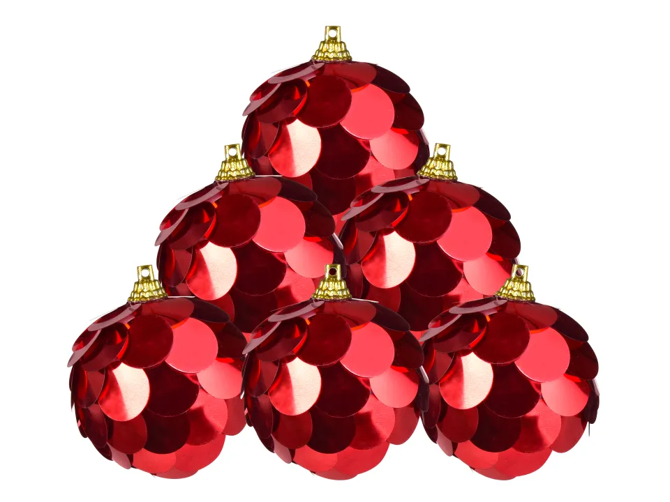 Szerelembe esel a piros tűz fényével! Minden golyó úgy ragyog, mint egy értékes ékszer. A nagy kerek flitterek átfedik egymást, mint a pikkelyek, és játszanak a fény minden sugarával. Ez a 6 golyóból álló szett a tökéletes választás a karácsonyfához, amely azonnal lenyűgöz – és mindenki szívét megdobogtatja, aki látja. A piros karácsony szenvedélye sosem megy ki a divatból!