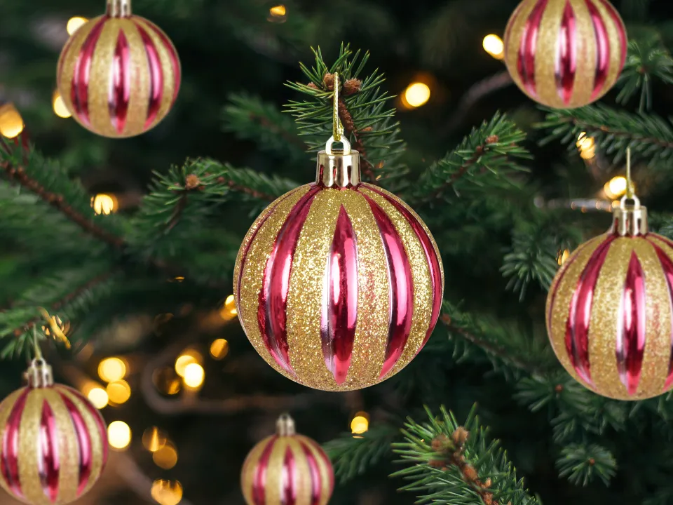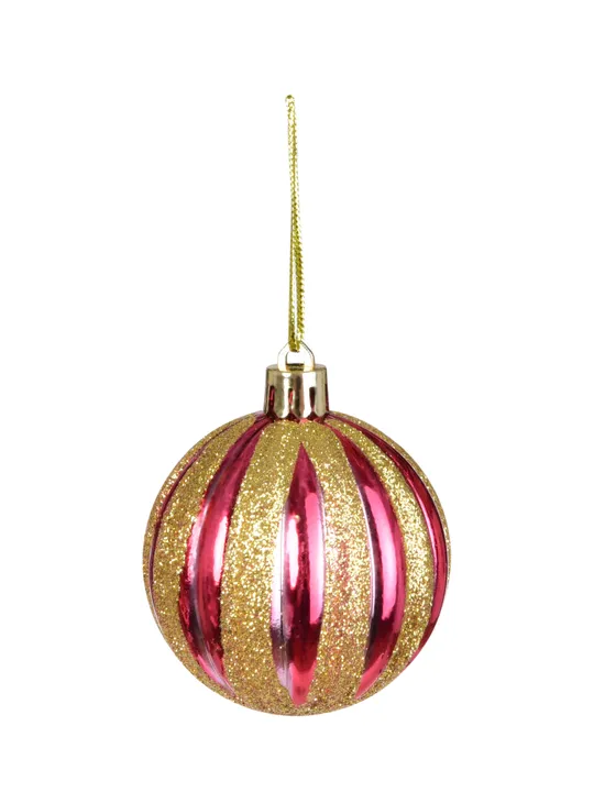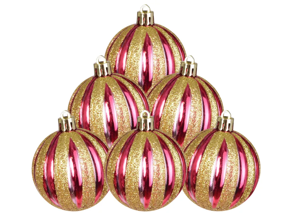 6 darab karácsonyi gömb készlet élénk piros színben, függőleges arany csillogó csíkokkal, ami nemes fényt és vidám ünnepi atmoszférát hoz az otthonába.