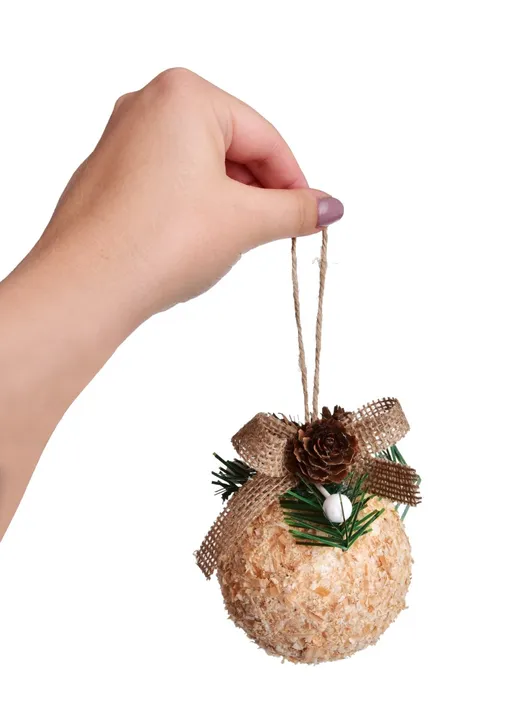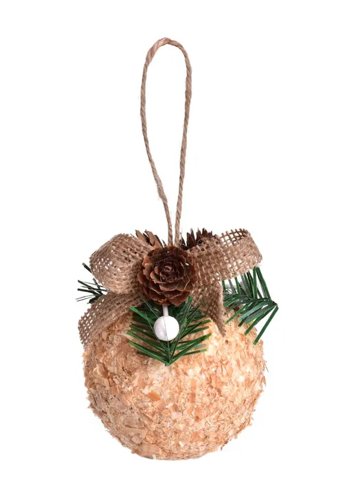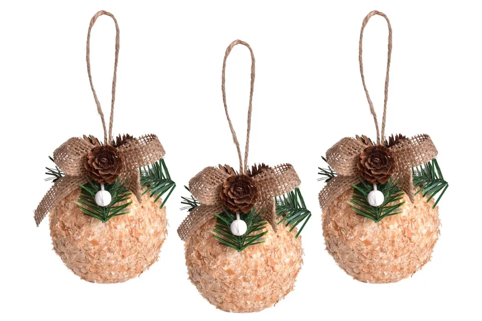 3 nagy karácsonyi gömb készlet, természetes jutából, ágakból és tobozokból készült díszítéssel, meleg rusztikus stílust hoz a dekorációba. A fából készült forgácsokból készült gömbök átmérője 8 cm, és jól kiegészítik a természetes és vidéki dekorációt.