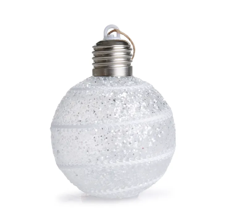 FÉNYLŐ LED GÖMB CSILLÁMOKKAL | karácsonyi dekoráció fehér szegéllyel | 8 cm