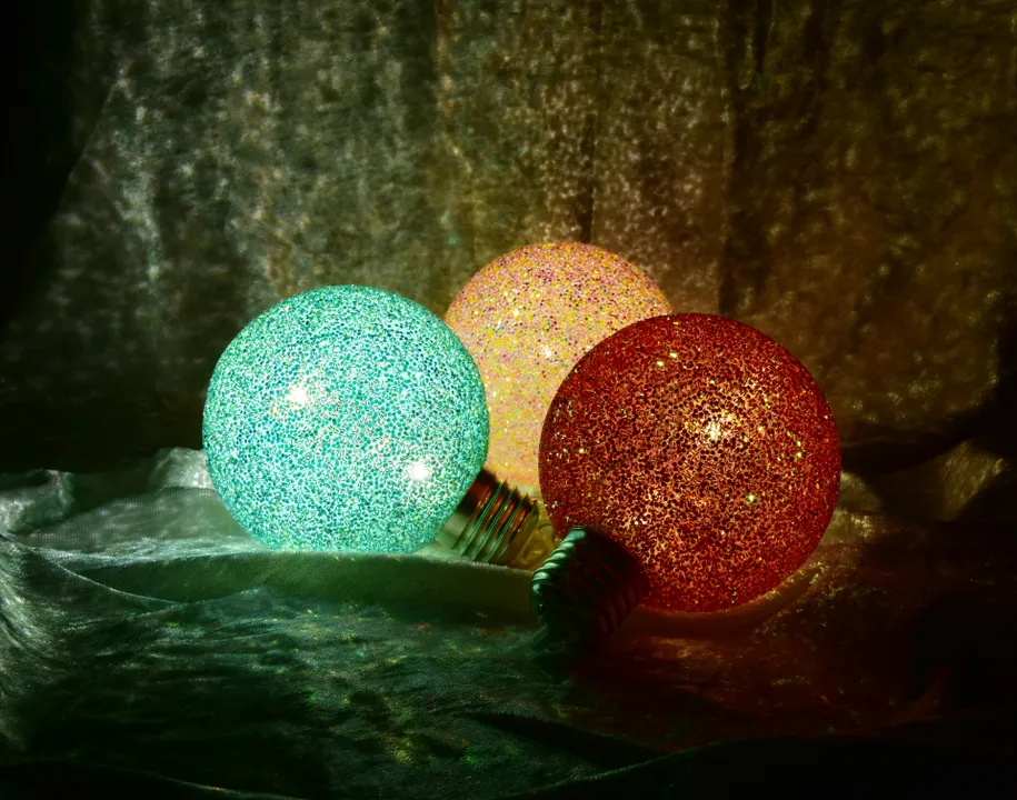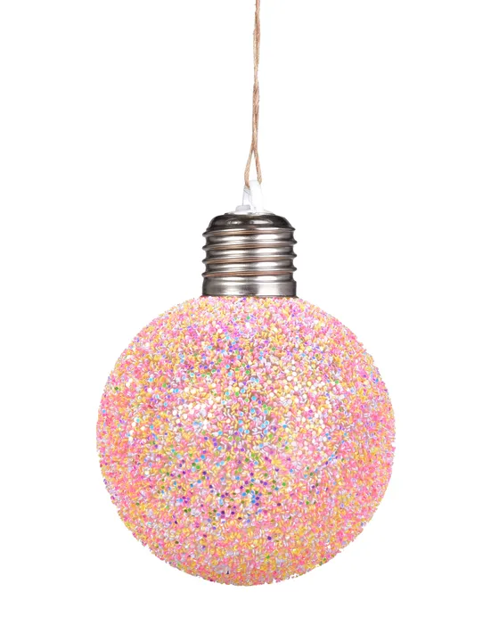 Amikor sötétedik, felragyog a lágy barackfényű LED gömb, és otthonos meleg fényt és finom csillogást tölt be a szobában. Minden színes flitter úgy veri vissza a fényt, mint apró drágakövek, így varázslatos légkört teremtve a nyugalom és kényelem érdekében. Ideális karácsonyi dekorációnak, és kellemes kiegészítő az év minden napján.