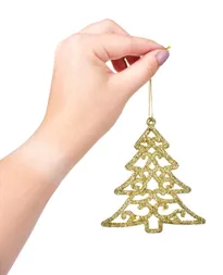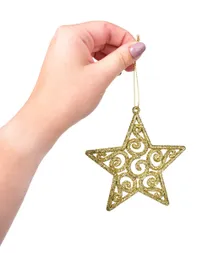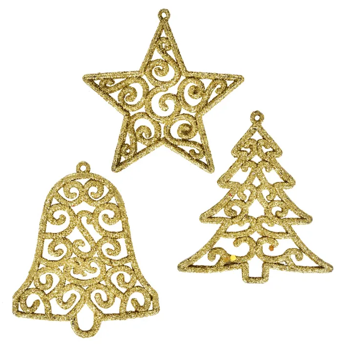 3 arany karácsonyi dísz készlet fenyőfa, csillag és harang formájában, csipkés csillogó hatással, amely finomságot és ünnepi fényt ad a dekorációnak. A könnyű műanyag dizájn arany csillámokkal gyönyörűen kiemelkedik a fán és az elrendezésben is.