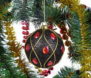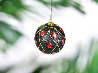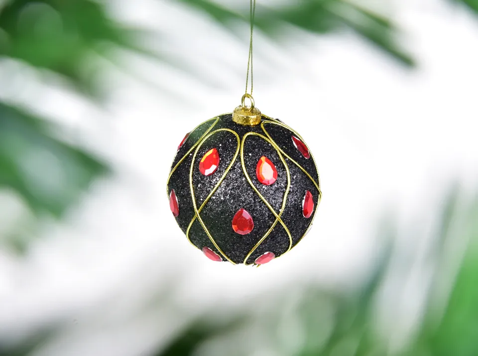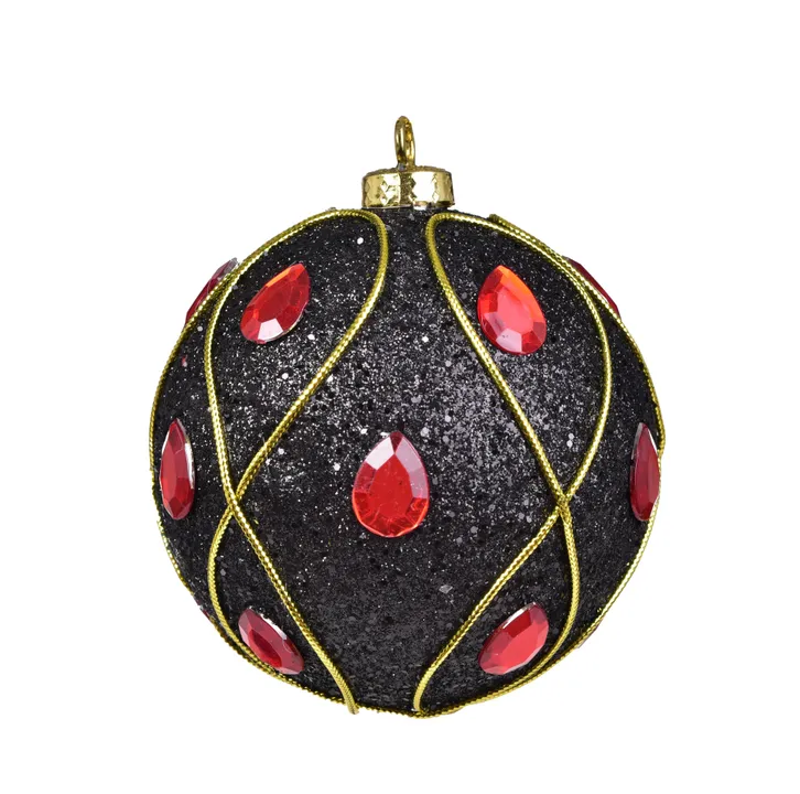 Luxusos XL karácsonyi gömb fekete csillogó kivitelben, vörös csepp alakú kövekkel és arany zsinóros ornamentikával díszítve. Az onyx és rubin kombinációja kiemeli az ünnepi dekorációt és mélységet kölcsönöz neki. Átmérője 9 cm.