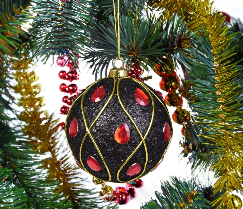 RUBIN CSEPPEK ÉS ONYX – dísz, mint a királyi ékszerdobozból. A csillogó fekete gömb vörös csepp alakú kövekkel és arany ornamentikával emlékeztet egy ragyogó drágakőre, amely felragyogtatja a legnagyobb sötétséget is.