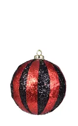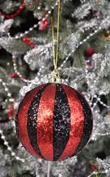 Extravagáns karácsonyi gömb fekete-piros csíkokkal, melyek az onyx és a rubin drágakövekre emlékeztetnek. Modern dísz, amely stílust és merész karaktert kölcsönöz a karácsonyfájának. Átmérője 9 cm.